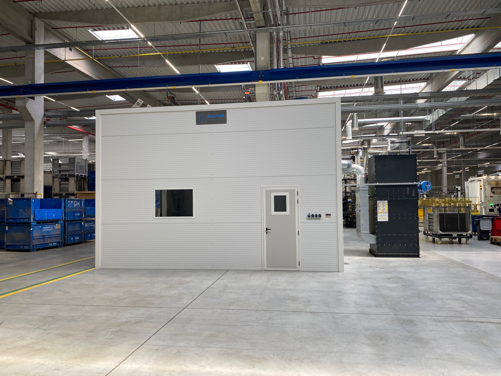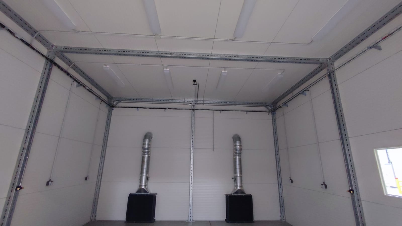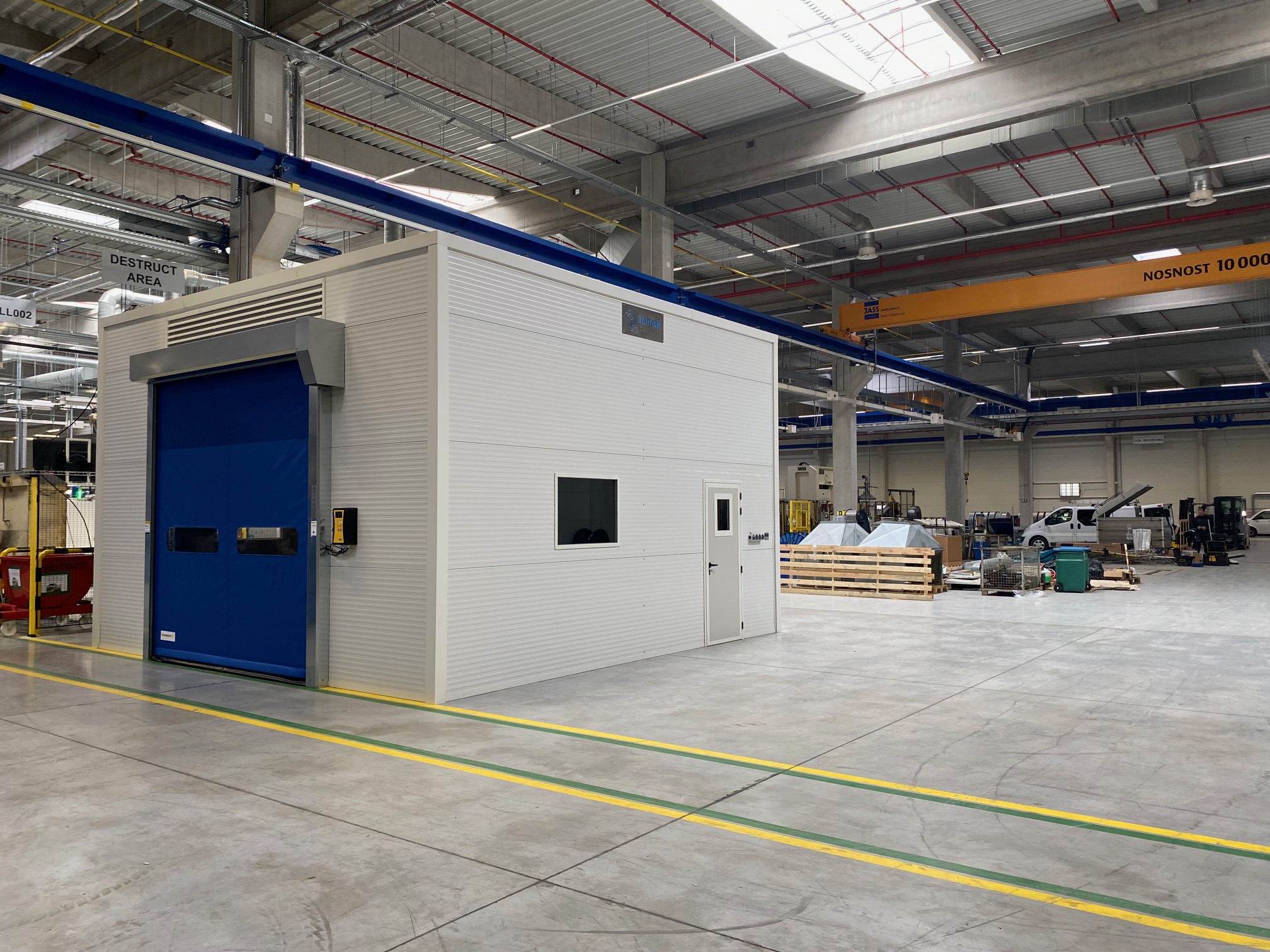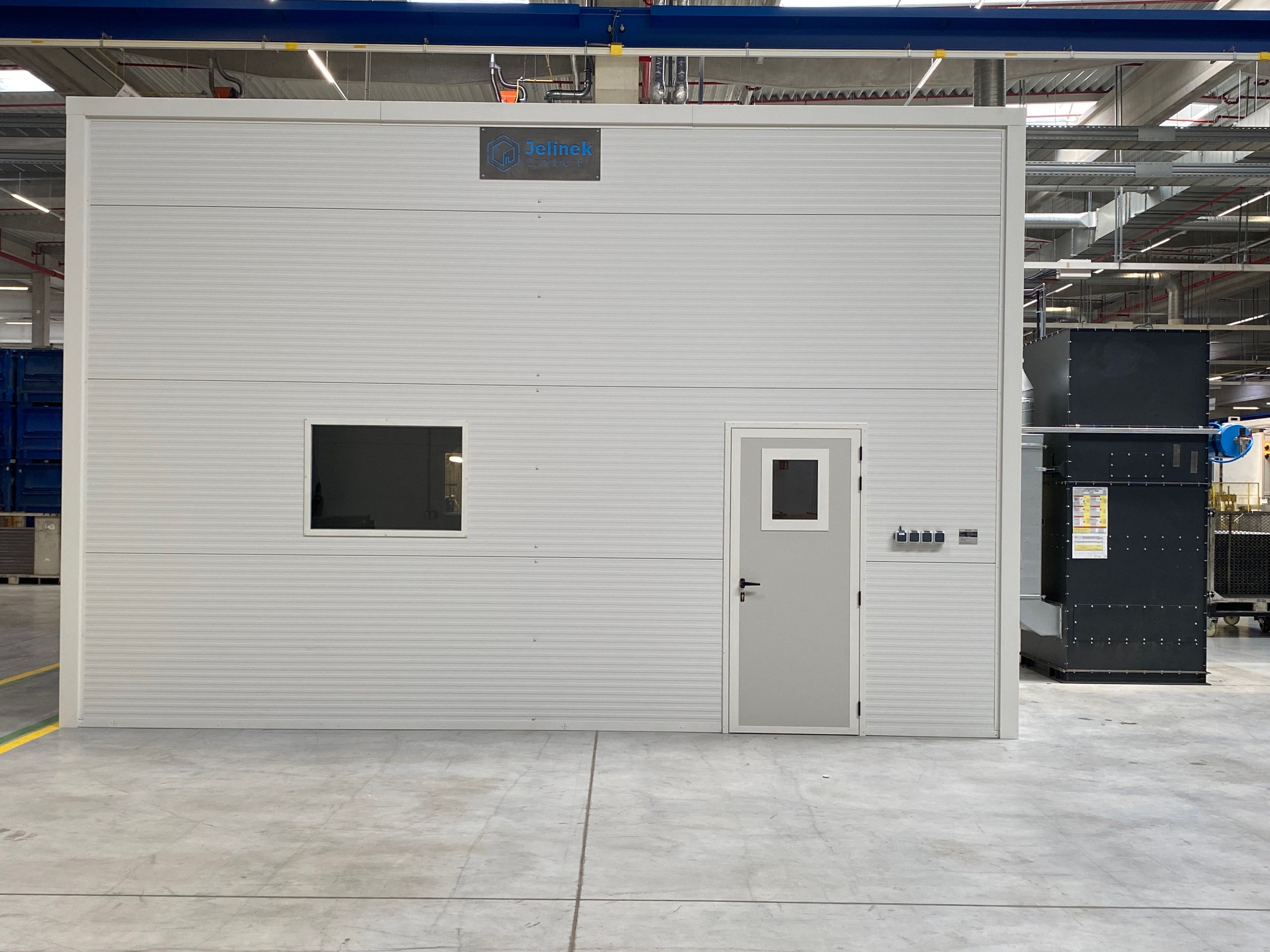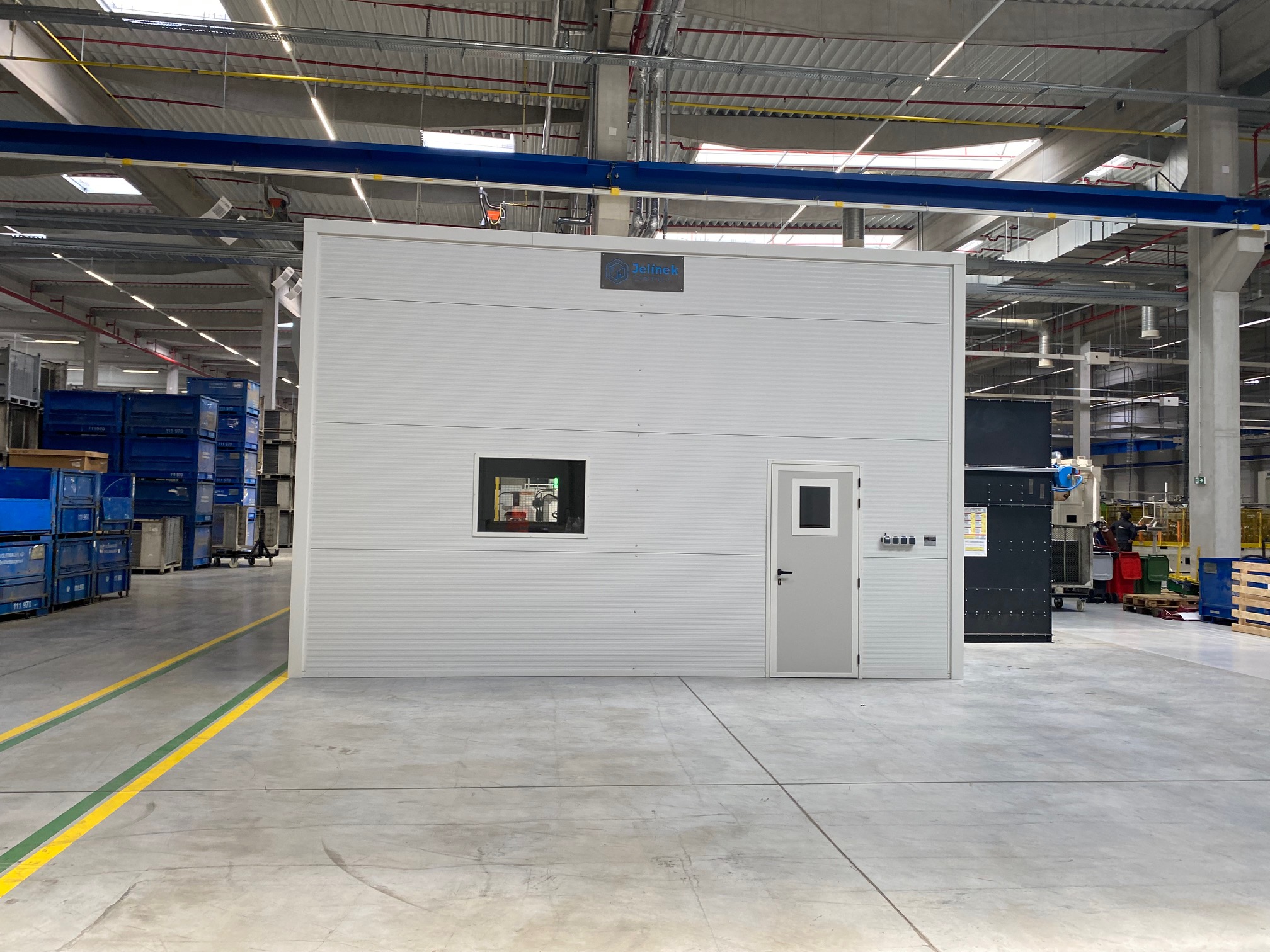 Vybavení boxu: kompletní elektroinstalace, 1x rychloběžná vrata, 1x vstupní dveře, 2x průhledová okna s bezpečnostním sklem