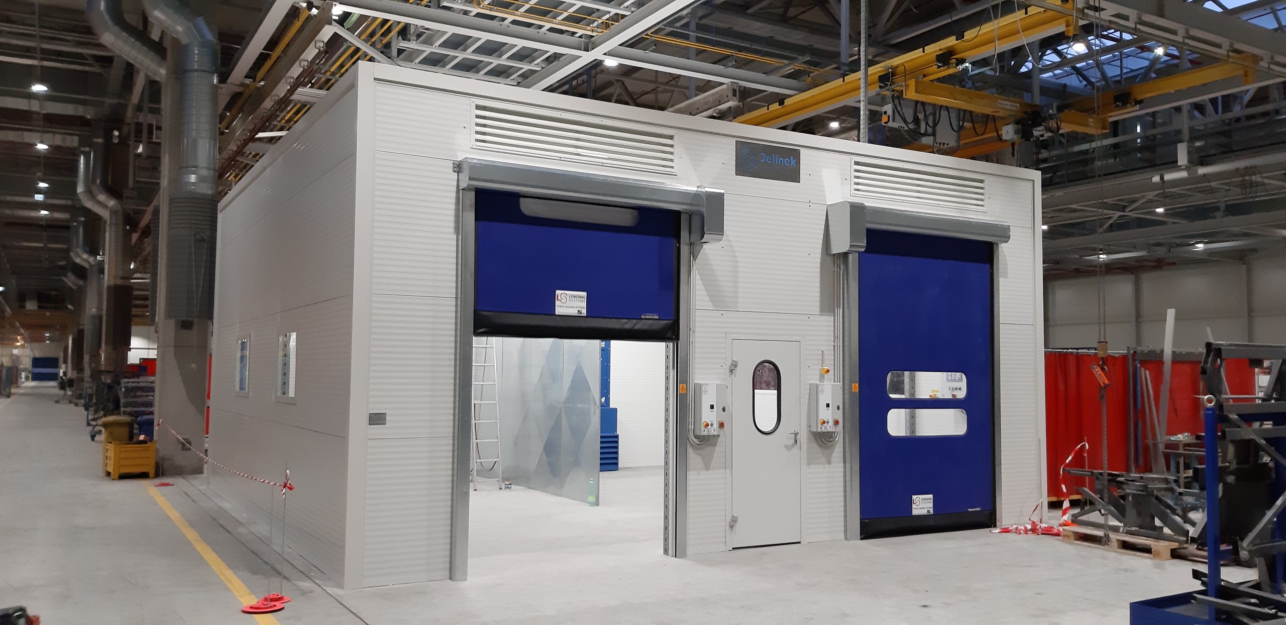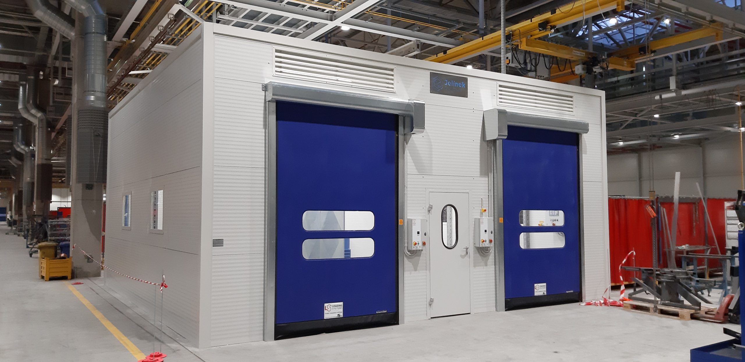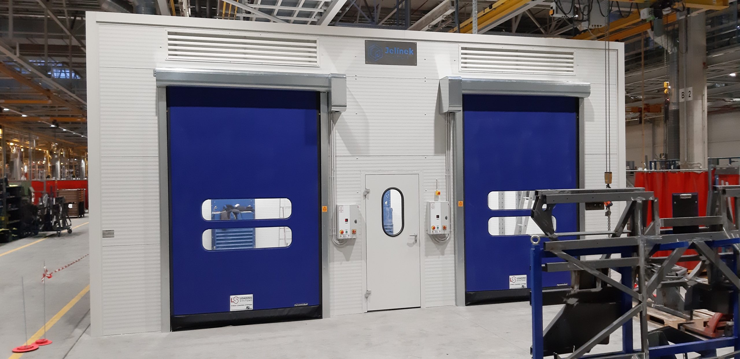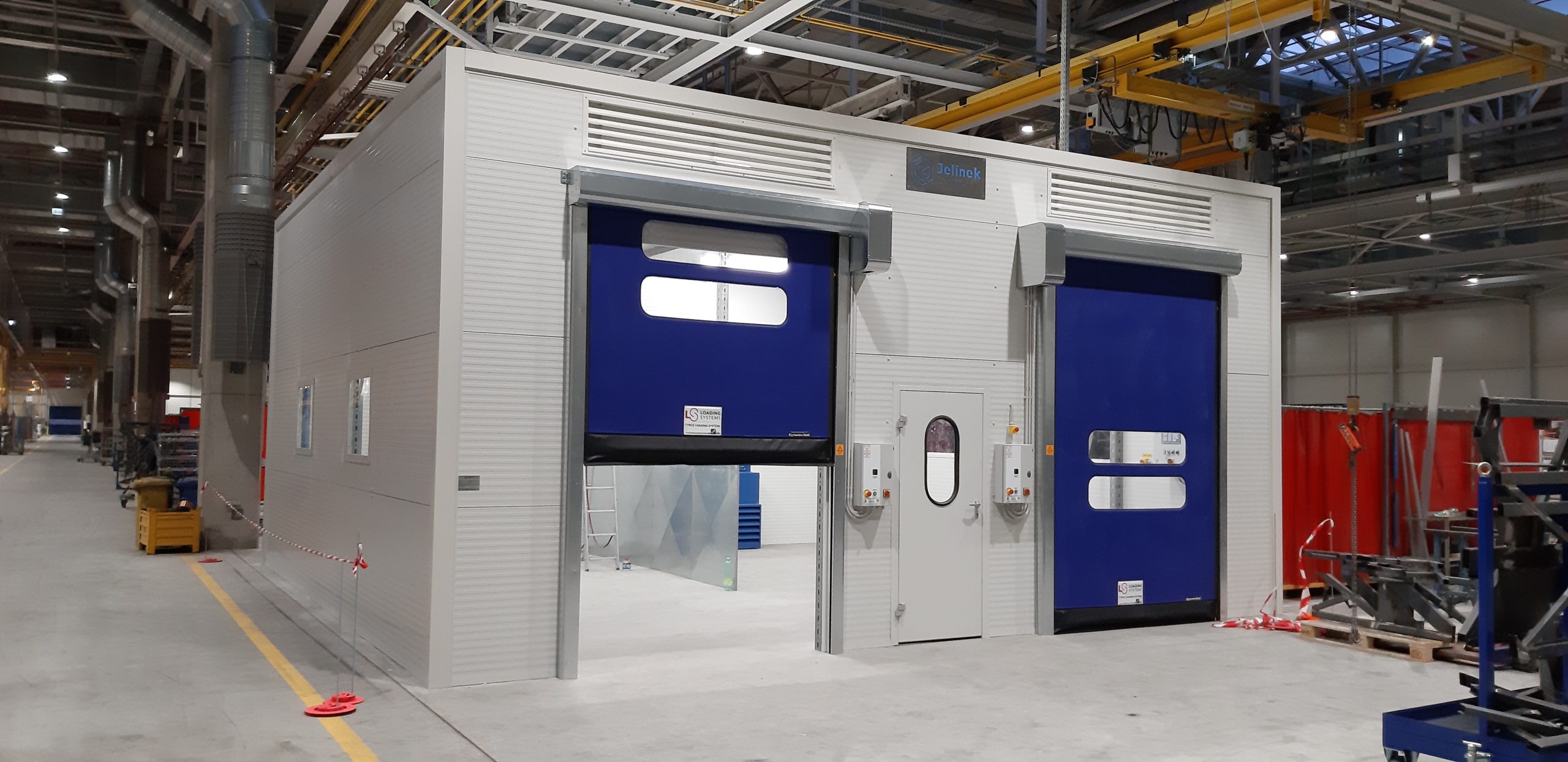 Vybavení boxu: rozvod stlačeného vzduchu, kompletní elektroinstalace, 2x rychloběžná vrata, 1x vstupní dveře, 4x průhledová okna s bezpečnostním sklem