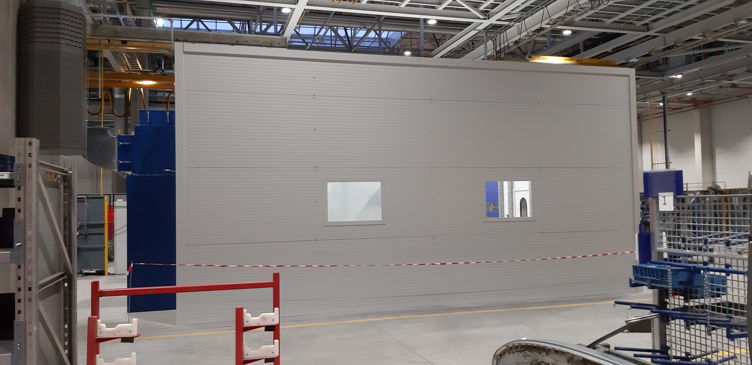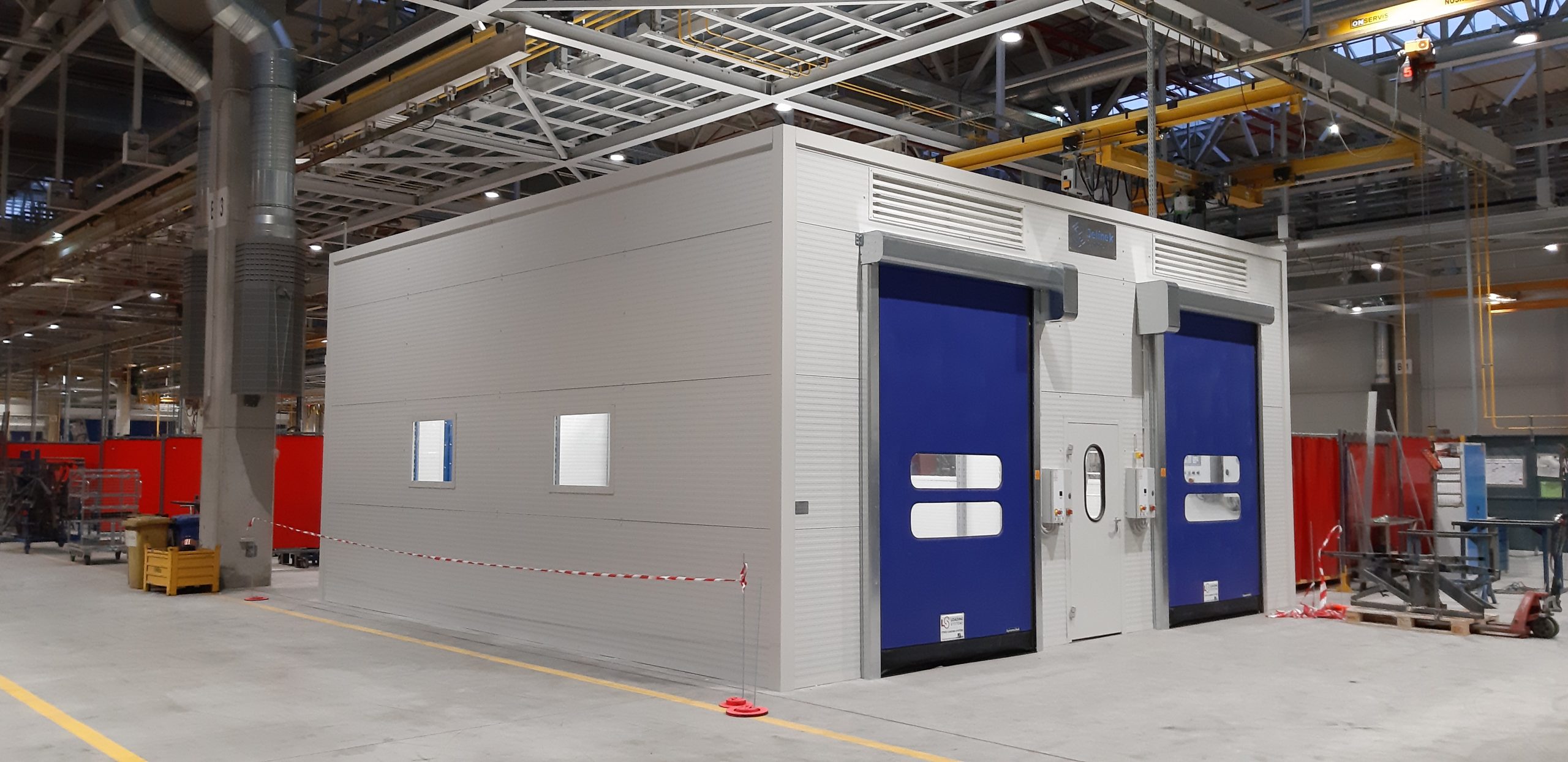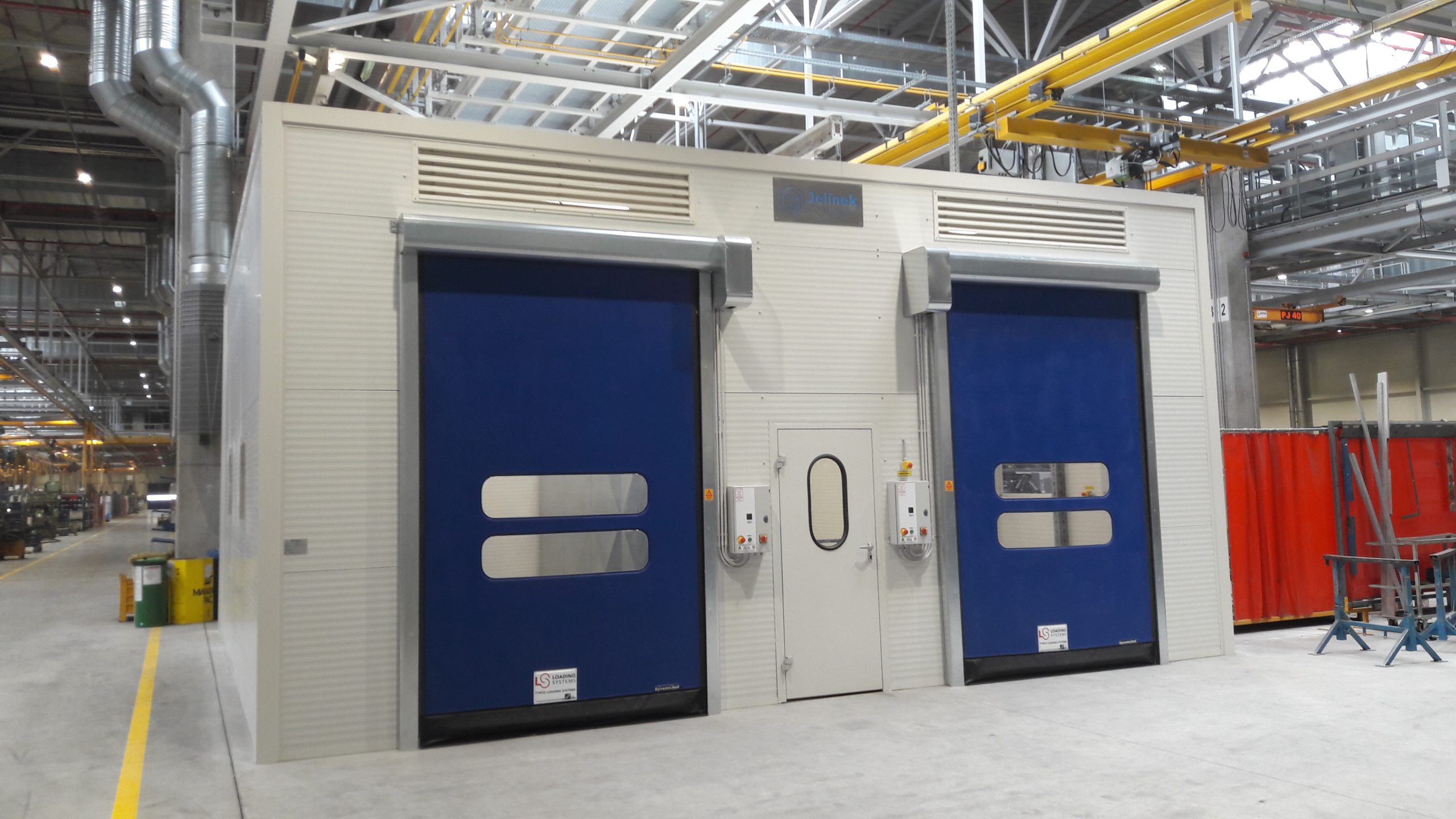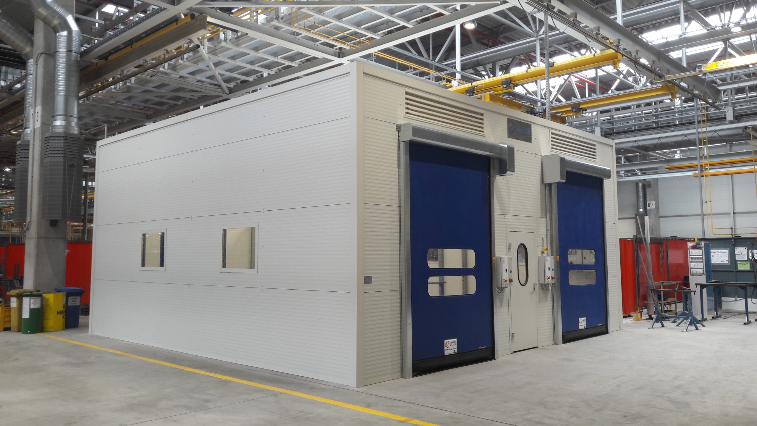 Vybavení boxu: rozvod stlačeného vzduchu, kompletní elektroinstalace, 2x rychloběžná vrata, 1x vstupní dveře, 4x průhledová okna s bezpečnostním sklem